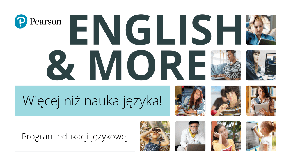 Wasz kurs, drodzy uczniowie, odbywa się w ramach programu edukacyjnego English & more, który realizujemy, bazując na materiałach Pearsona – światowego lidera w dziedzinie edukacji. Dzięki temu macie pewność, że stosowane materiały dydaktyczne są najwyżej jakości, a cele nauki odpowiadają współczesnym realiom i potrzebom dzisiejszego – i jutrzejszego – użytkownika języka angielskiego.